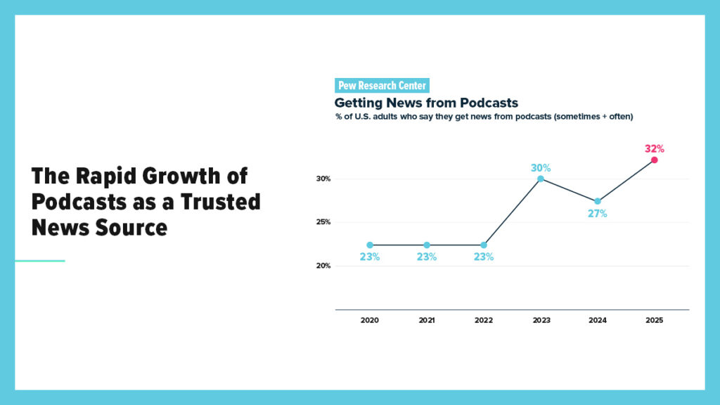 A similar report from Pew Research Center shows that Americans’ reliance on podcasts for news has followed a slower but equally important growth trajectory. Nearly a third of American adults often or sometimes get their news from podcasts, compared to just 22% five years ago. This growth trend is mainly driven by college-educated young adults, with listeners across the board gravitating toward in-depth news analysis programs over opinion-based shows or headline summaries. However, partisanship plays a role in determining perceived credibility – while only a minority of listeners say they trust podcasts more than other news outlets, Republicans are twice as likely as Democrats to hold this view.