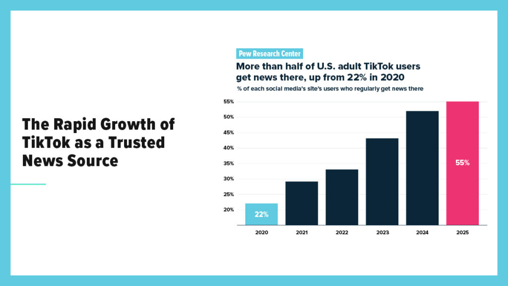 According to a recent report from Pew Research Center, the share of American adults who regularly get their news from TikTok has increased drastically over the past five years, from just 3% in 2020 to one in five today – making it one of the fastest-growing news sources in the country. The platform has shifted from being known primarily for sharing comedic clips and viral dances to becoming a trusted outlet for news aggregation and coverage of current events. In fact, a majority of TikTok users regularly consume news from the app at rates comparable to X and Facebook – platforms that have become synonymous with news consumption in the digital age.
